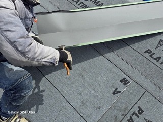 こんにちは。街の屋根やさん新居浜・四国中央店です。四国中央市で、セメント瓦からカレッセ(横葺き金属屋根材)に葺き替え工事を行った事例をご紹介しています。今回のブログでは、カレッセ本体を葺き上げる様子をご紹介します。前回までのブログはこちら 四国中央市で、葺き替えをご依頼くださった…