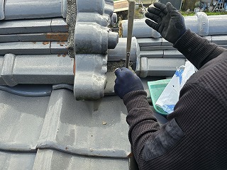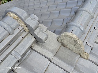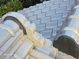 ・新居浜市で和型釉薬瓦の漆喰剥がれ補修工事。剥がれて欠けた漆喰を取り除き塗り直しました。